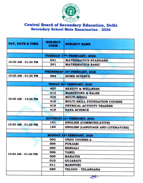 | 23 Feb 2026 | Monday | 10:30 AM – 01:30 PM | Regional / Second Language subjects (Urdu, Punjabi, Bengali, Tamil, Marathi, etc.) | |