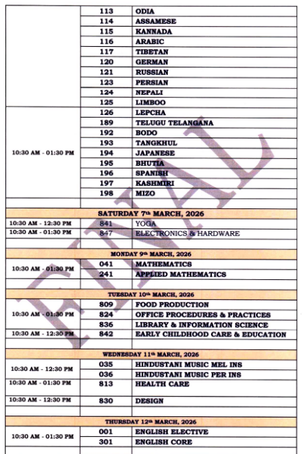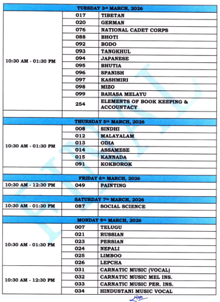 | 5 Mar 2026 | Thursday | 10:30 AM – 01:30 PM | Language / Regional subjects like Malayalam, Odia, Assamese, Kannada etc. | |