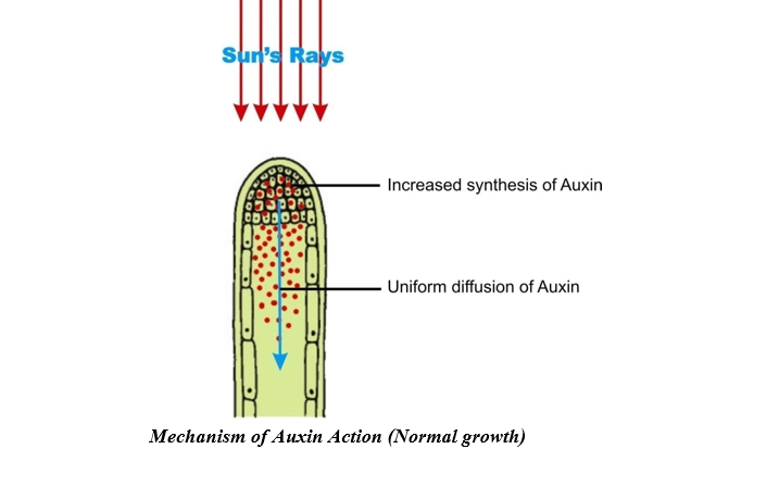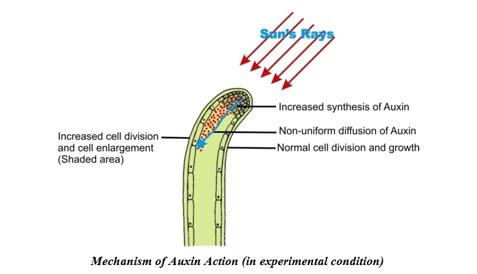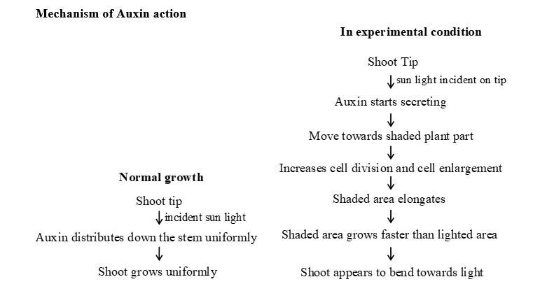 The principle hormone taking part in phototropism is “Auxin”. The flowchart explaining the mechanism of auxin action is as follows: