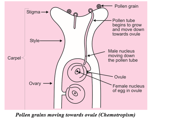 For example, during the process of fertilization, the pollen tube grows towards the ovule, because stigma produces a chemical in response to which pollen tube grows towards ovule.