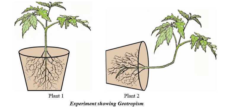 Experiment and explanation: Let us understand the phenomenon with the help of an experiment. Take two potted plant namely 1 and 2. Keep one of them say 1 in normal condition and put 2 in horizontal condition.