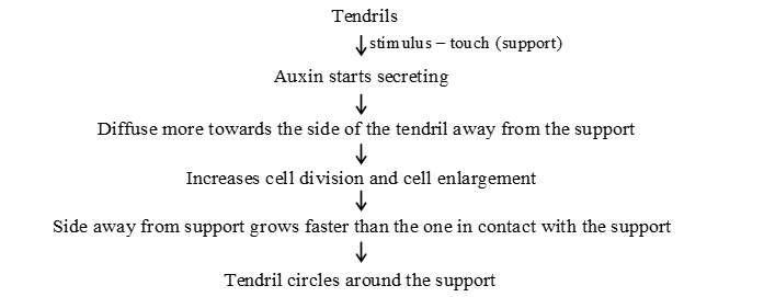 Experiment and explanation: The grape vine has a weak stem, so it cannot stand erect. To stand erect it needs support to which tendril (an outgrowth on the stem) binds. The tendril grows as it touches the support. The side of the tendril which touches the support grows slowly as compared to the other side which is not in contact. This phenomenon in response to touch is called as “thigmotropism”. The flow chart explaining the mechanism is as follows :