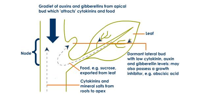 Auxins induce apical dominance, where the apical bud suppressed the growth of lateral buds.