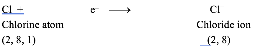 - Chlorine (2,8,7) gains one electron → Cl⁻ (2,8,8)