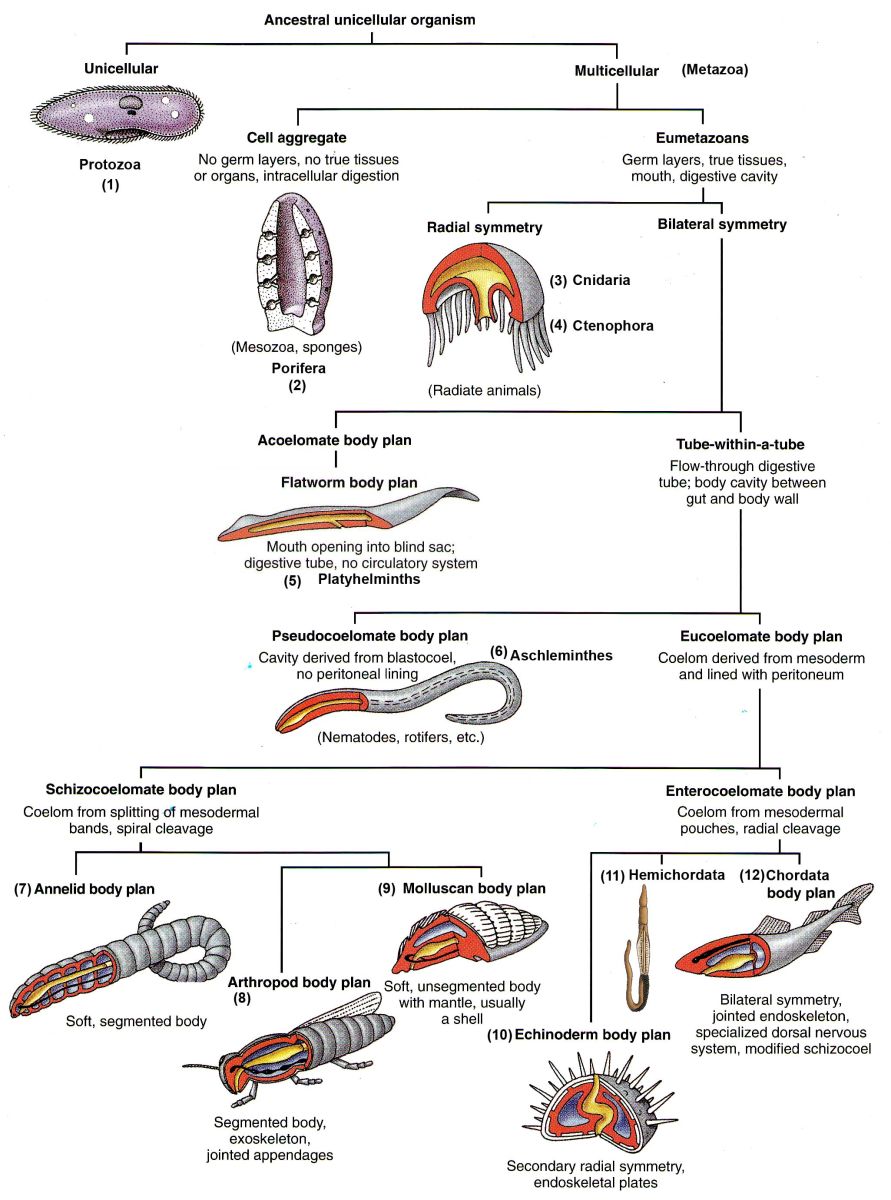 Ctenophora | No organs; by surface | — | Diffuse nerve network | Hermaphrodite; external fertilization; indirect (cydippid larva) |