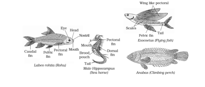 - In size, they vary from 10 mm to 4 meters e.g., Labeo, Hippocampus (sea horse), Anabas (climbing perch), Muraena (eel), Protopterus (fish).