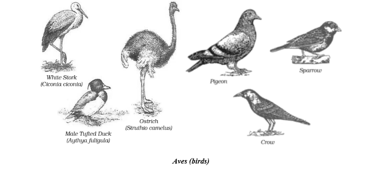 E.g., Columbo (pigeon), Struthio (ostrich), Pavo (pea fowl), Passer (sparrow), Corvus splendens (crow) etc. Kiwi, Penguin and Ostrich are examples of flightless birds.
