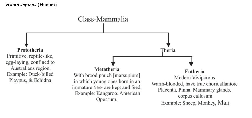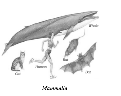 Mammals are characterized by having milk-secreting mammary glands. E.g., Macropus (kangaroo), Bat, Rattus (rat), Felis (cat), Panthera (lion, tiger, leopard), Elephas (elephant), Balaena (whale), Macaca (monkey) Homo sapiens (Human).