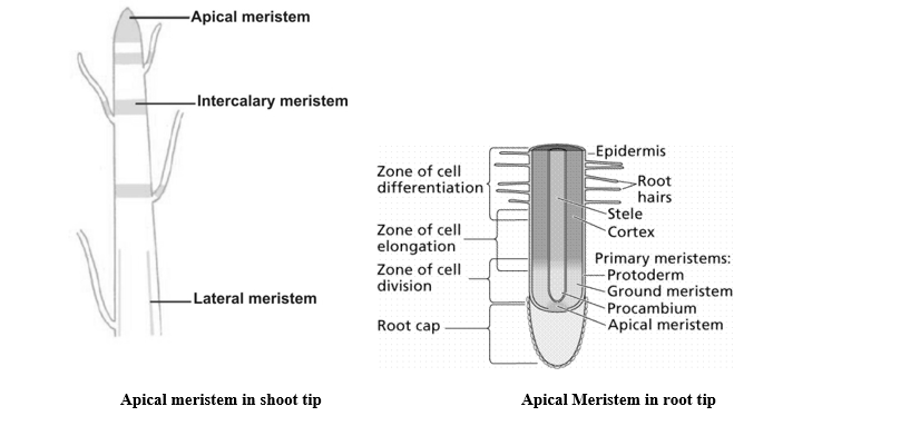 - Apical meristem is present at the growing tips of stem and root.