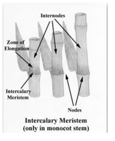 - Intercalary meristem is present at the base of the leaves or internodes.