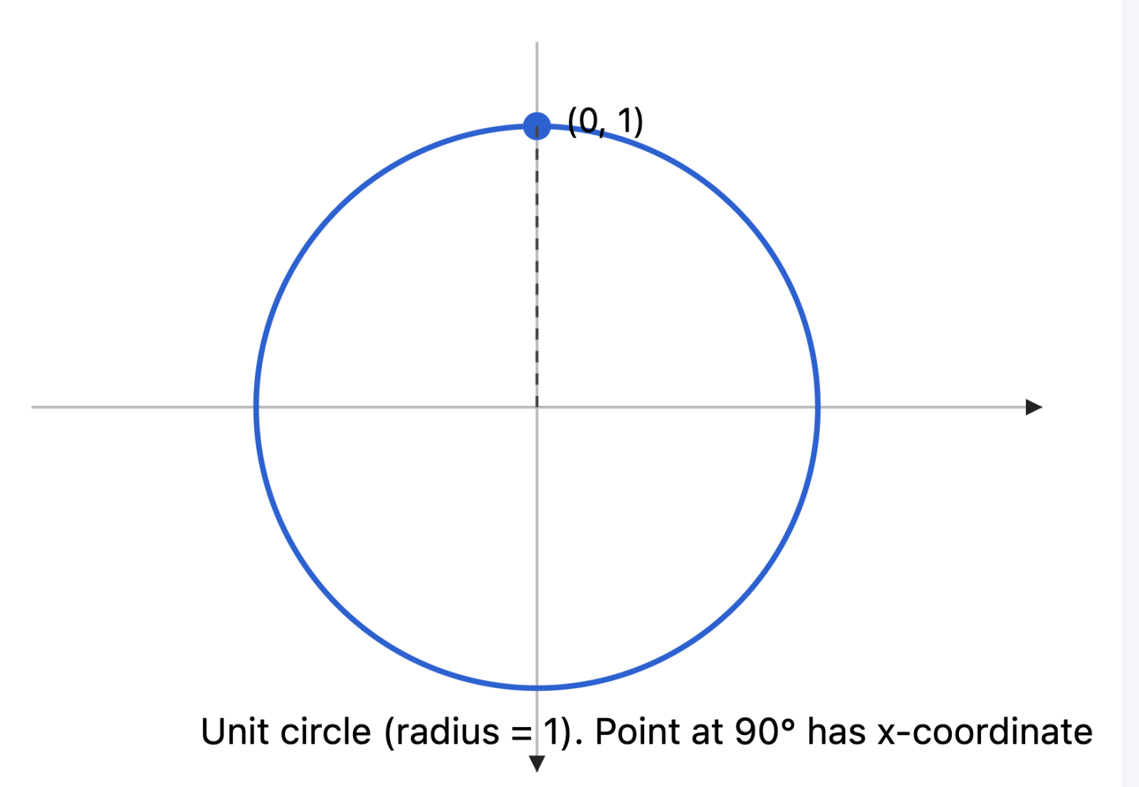 Visual summary: the point for 90° sits directly above the origin, so its x-coordinate is 0.